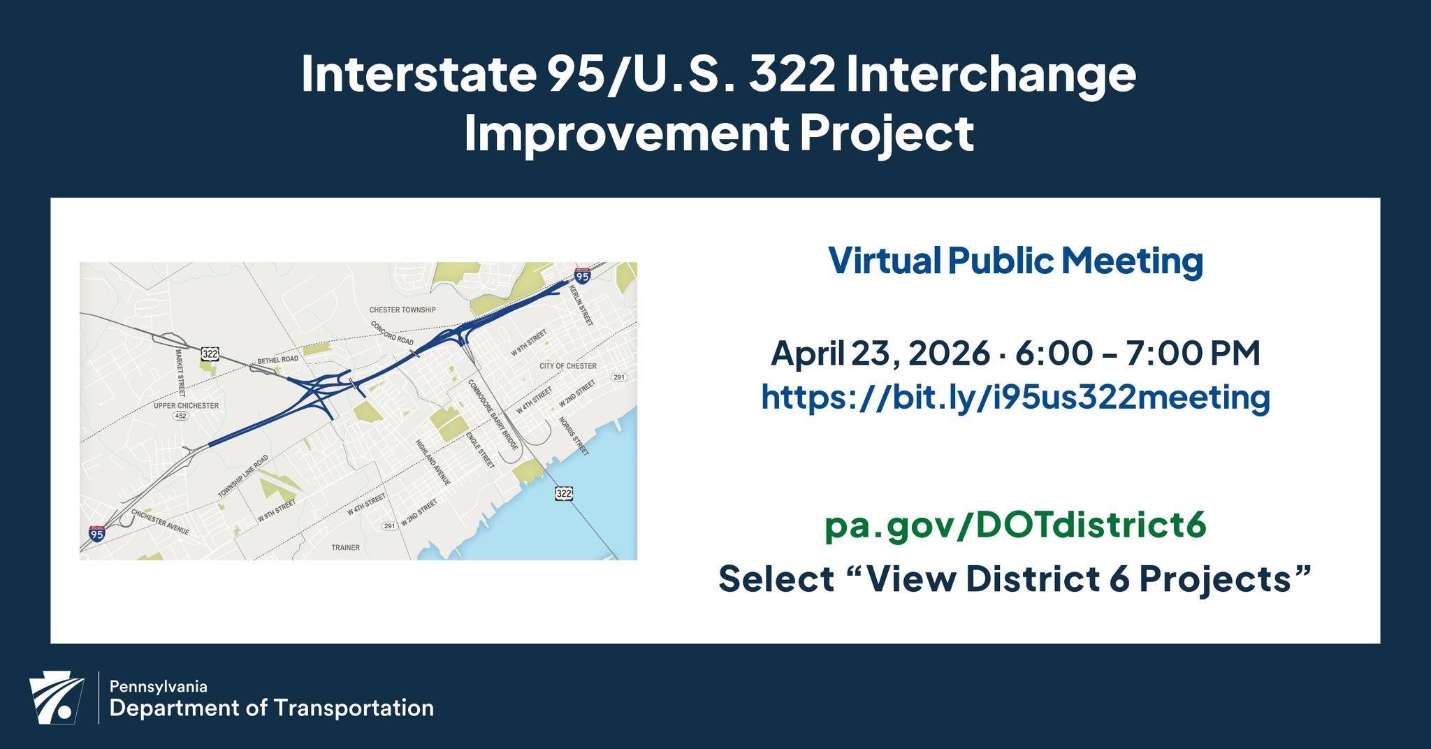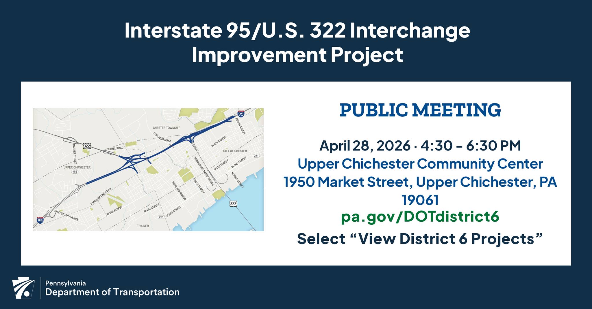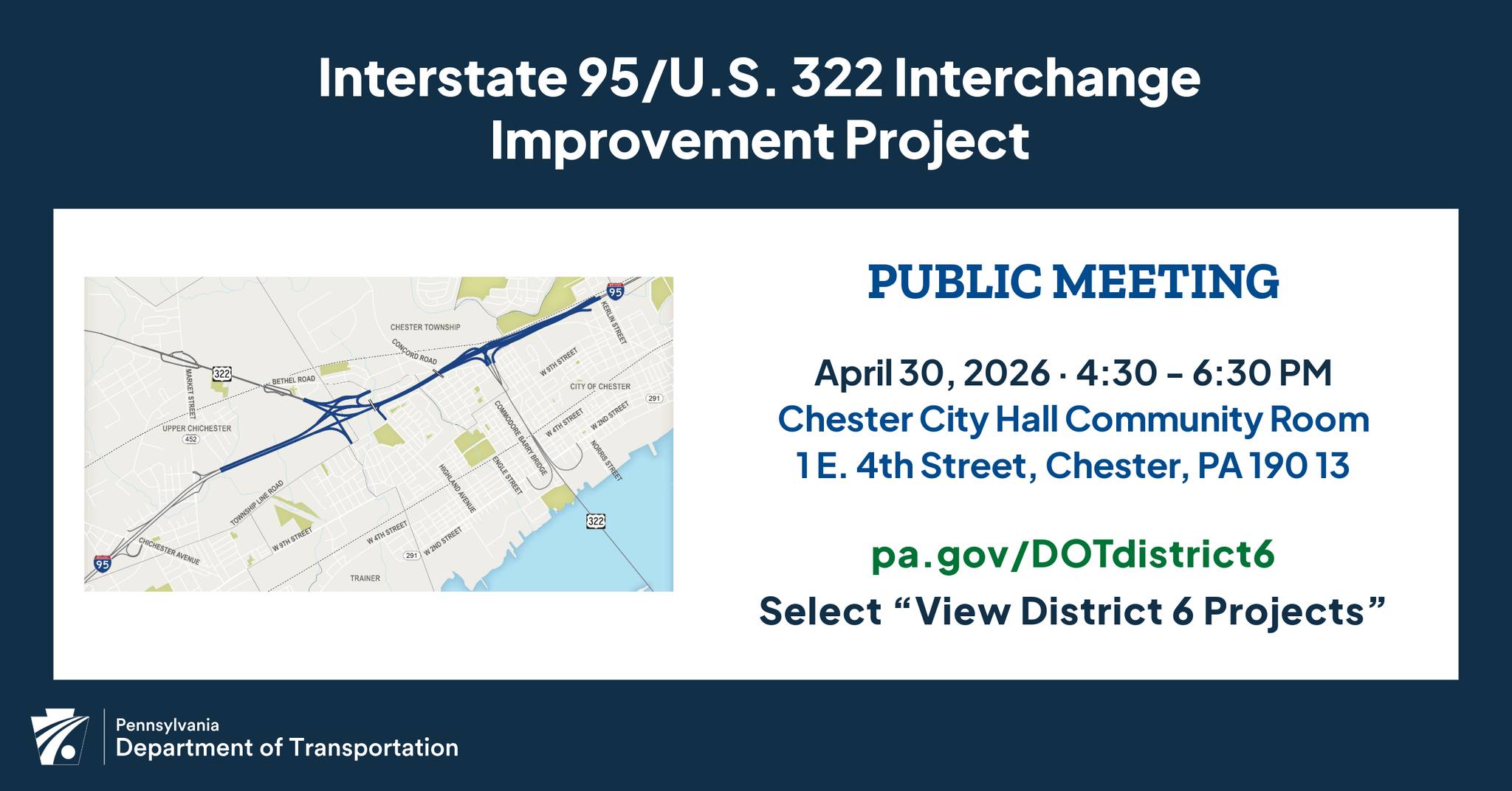 The public is invited to attend a public meeting hosted by PennDOT, on April 30 from 4:30 PM to 6:30 PM to learn about the proposed project to improve the I-95/U.S. 322 Interchange in Chester and Upper Chichester townships, and the City of Chester.
