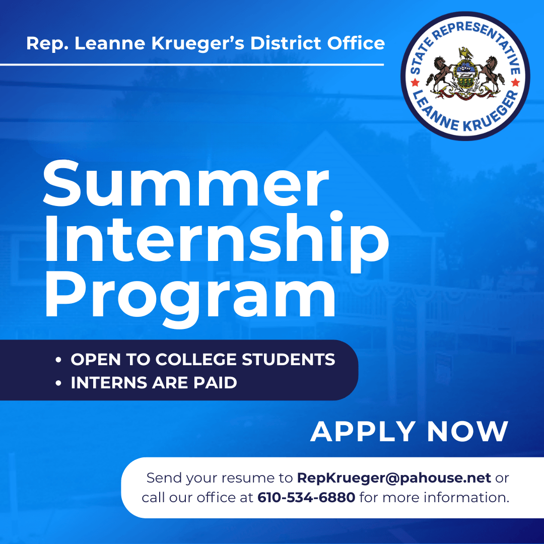 Know a college student looking for an internship over summer break? We’re hiring summer legislative interns for my district office in Brookhaven. All interns are paid and schedules can be built around the end of spring semester and the start of fall semester. We’re accepting resumes by email at RepKrueger@pahouse.net, or you can give us a call for more information.