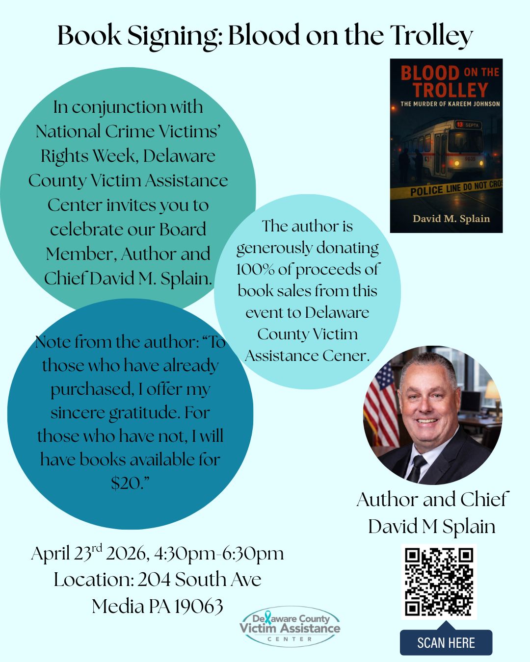 Join Chief David Splain, Nether Providence Police, Board Member of Delaware County Victim Assistance Center and AUTHOR of Blood on the Trolley: The Murder of Kareem Johnson.