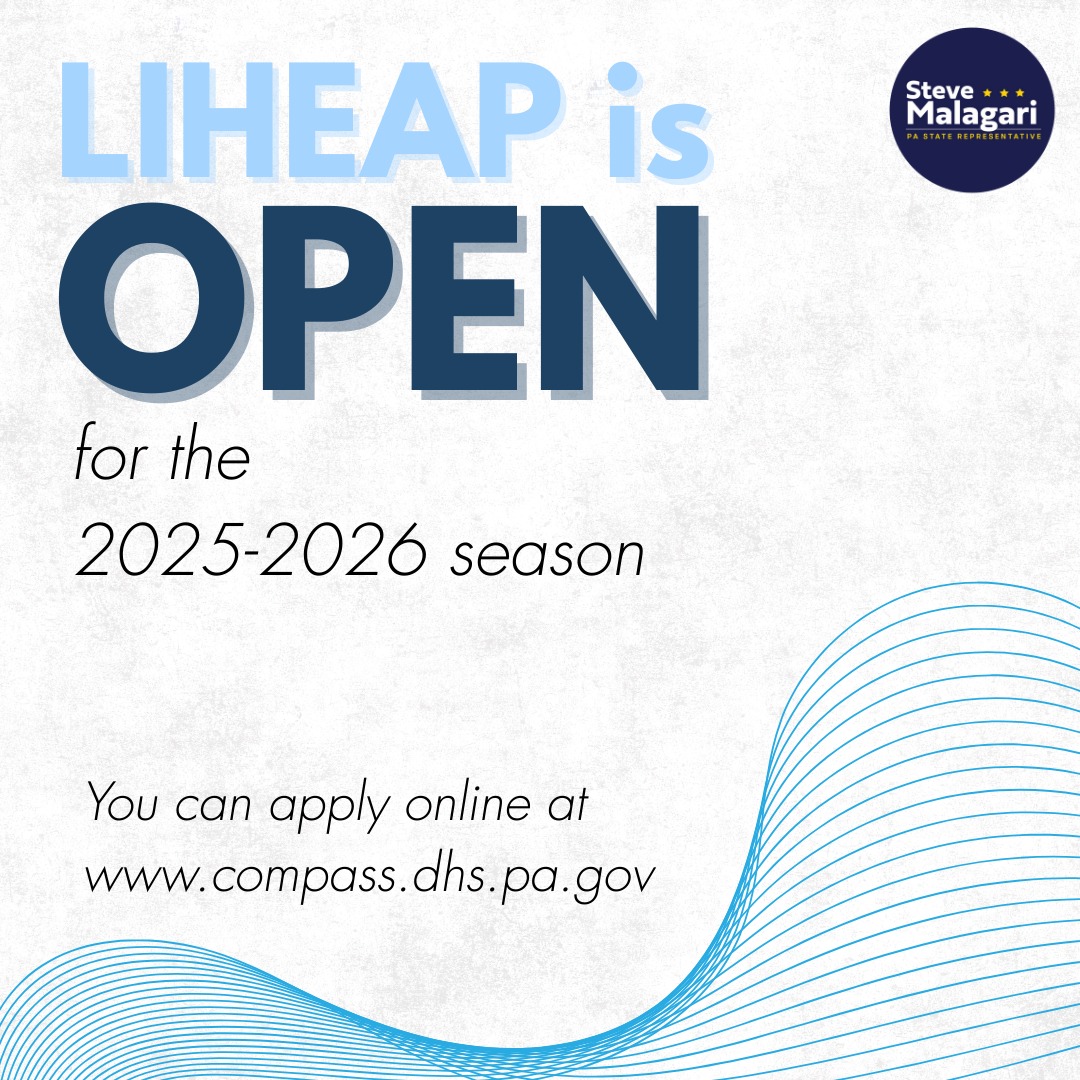 Applications are now available for LIHEAP, the program that helps Pennsylvanians to heat their homes during the colder seasons. Eligible households can receive up to $1,000 towards their utility bill, depending on one’s income and heating type. You can apply online through COMPASS or get help applying at my office through the end of the season on April 10th, 2026.