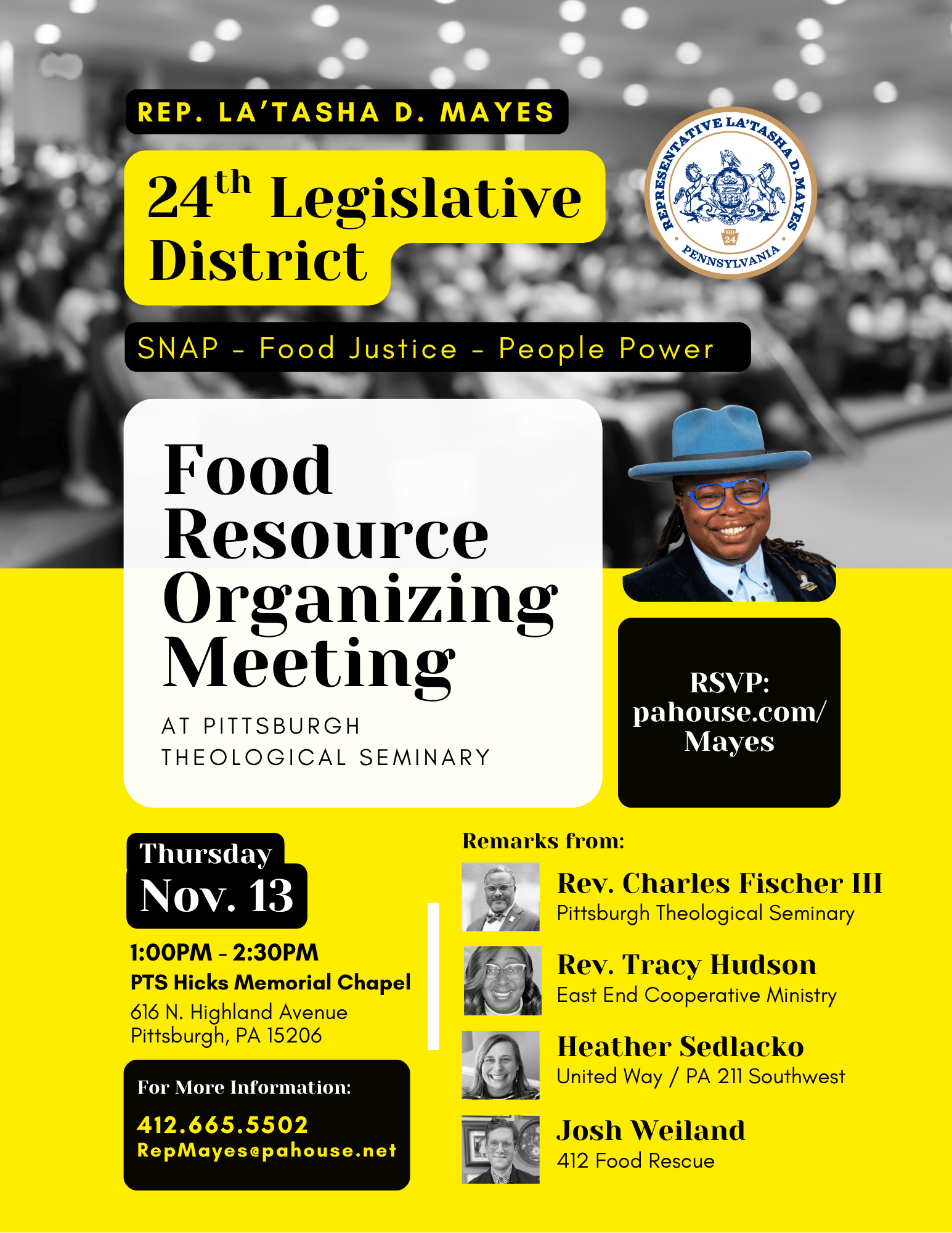Please join me for my 24th Legislative District Food Resource Organizing Meeting this Thursday, November 13, at 1:00 PM at Pittsburgh Theological Seminary’s Hicks Memorial Chapel. We’ll exchange information, strategize, and network to ensure that no person — especially mothers and families — goes hungry, particularly during times of government shutdowns or cuts to SNAP.