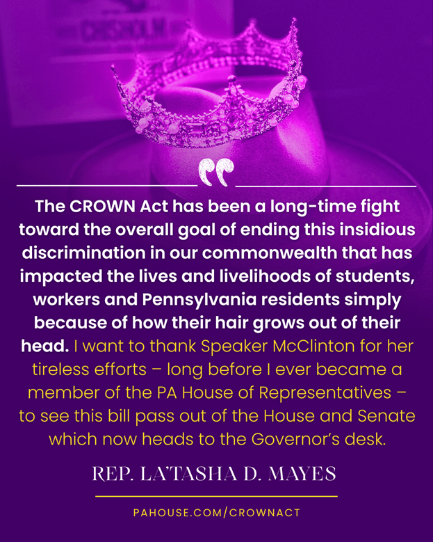I also want to thank my staff in Harrisburg and Pittsburgh; the statewide PA CROWN Act coalition of over 100 organizations, businesses, unions, municipalities, and entities that have garnered public support for House Bill 439 all across this commonwealth; Dr. Adjoa B. Asamoah, the CROWN Act champion who has led this fight for years at the federal level; the national CROWN Act Coalition; and so many more!