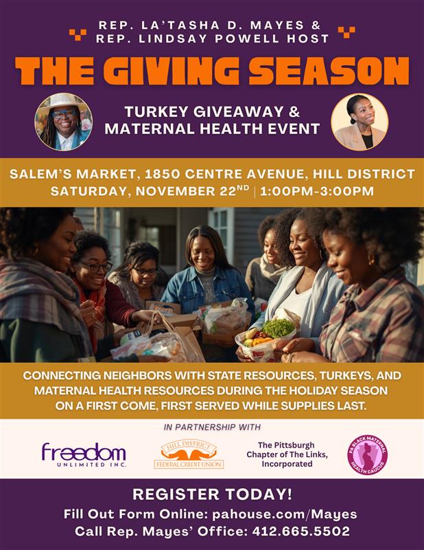 Rep. Lindsey Powell and I are hosting “The Giving Season,” our Thanksgiving Food Resource and Maternal Health event on this Saturday, November 22, from 1:00–3:00 PM at Salem’s Market, 1850 Centre Avenue in the Hill District!