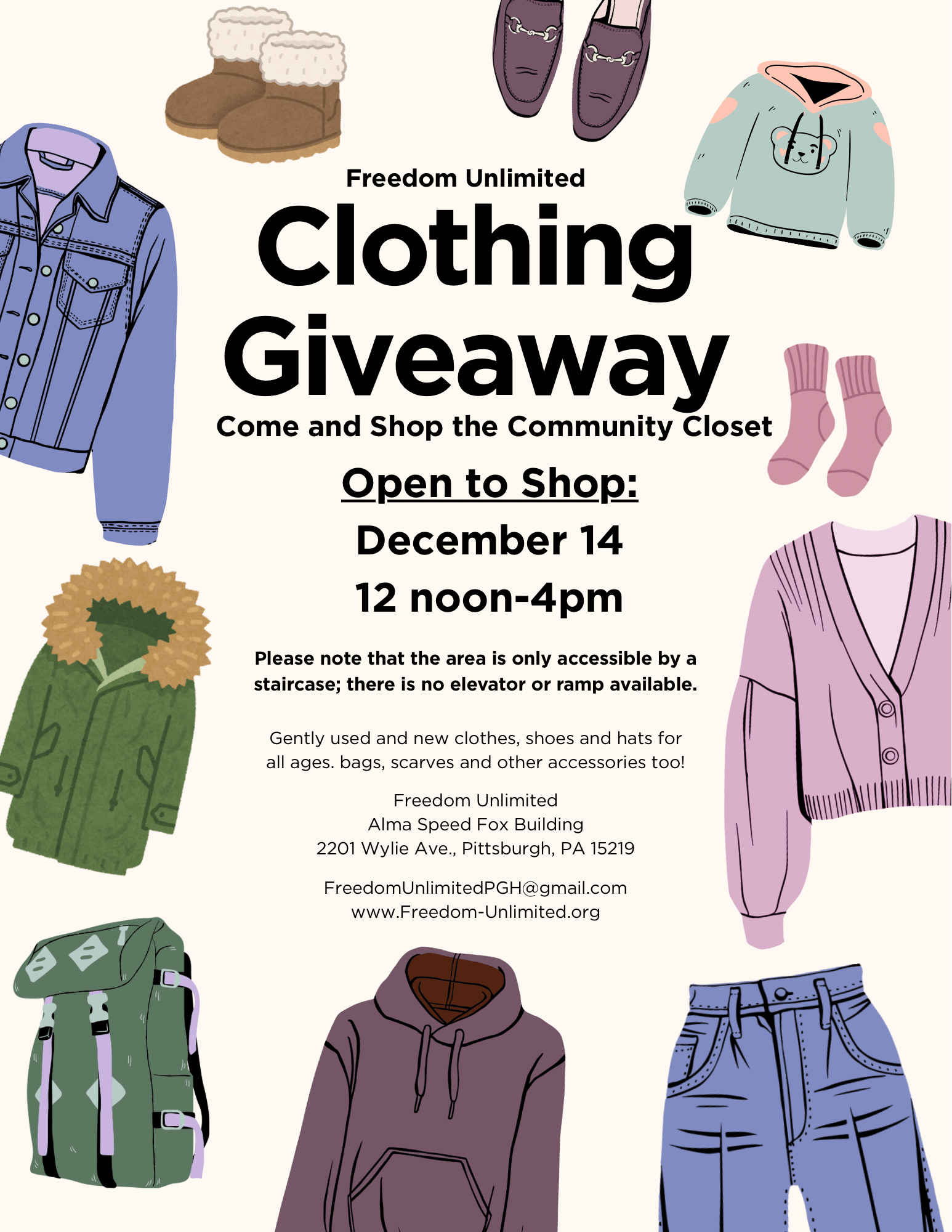 Enjoy cookies, cocoa, coffee, tea, festive holiday music, and get assistance with state programs including LIHEAP, Property Tax/Rent Rebates, and Unclaimed Property. Freedom Unlimited will also host a Clothing Giveaway the same day, 12:00–4:00 PM, at the same location—so spread the word!