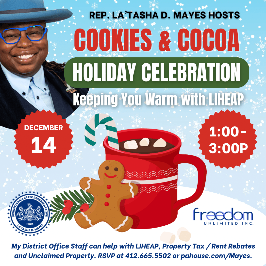 Join me for a community gathering as we celebrate the holiday season at my first Cookies & Cocoa in partnership with Freedom Unlimited, Sunday, December 14, 1:00-3:00PM, 2201 Wylie Avenue at Freedom Unlimited, 2201 Wylie Avenue in the Hill District.