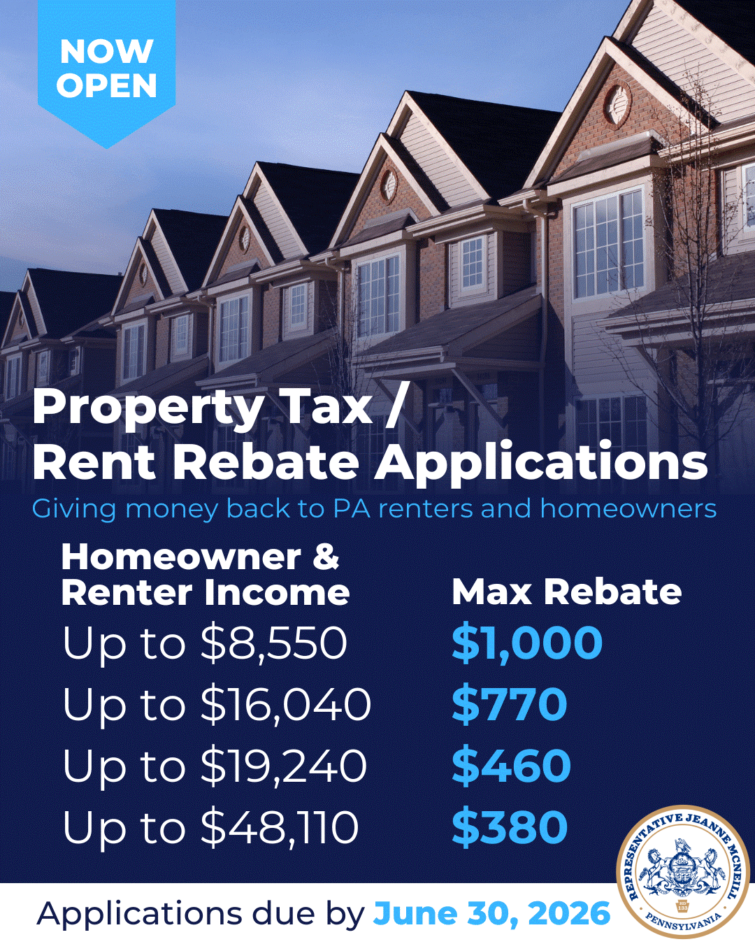 The Property Tax/Rent Rebate Program is now accepting applications. Income-eligible residents—including seniors age 65 or older, widows and widowers age 50 or older, and individuals with a disability age 18 or older—can claim rebates on property taxes or rent paid in 2025. The maximum qualifying income is $46,520 for both homeowners and renters, and 50% of Social Security income is excluded when determining eligibility.