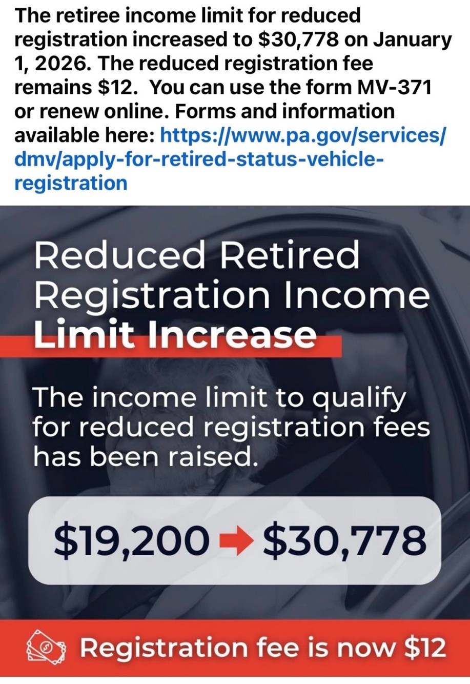 Good news! The income limit for the reduced vehicle registration fee has increased. If you are 65 or older and your income is under $30,778, you may qualify for a reduced registration fee and save $36 on your car.