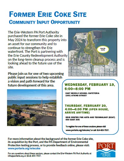 Plans to improve the Erie waterfront at the former Erie Coke site are being made. If you would like to have your say on its development and future use of the area, consider attending the Community Open House between 4 p.m. and 6 p.m. today, Feb. 20, at the Erie Center for Arts & Technology, 650 East Ave. You also may provide feedback online here.