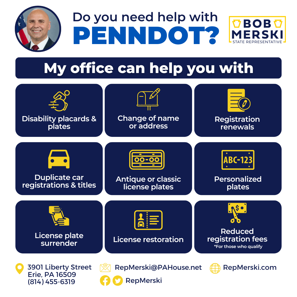 My offices are here to help you. We provide a wealth of information and state assistance on all kinds of state issues, programs and resources, including PennDOT. Check out the graphic above to see the variety of PennDOT issues we can help with.