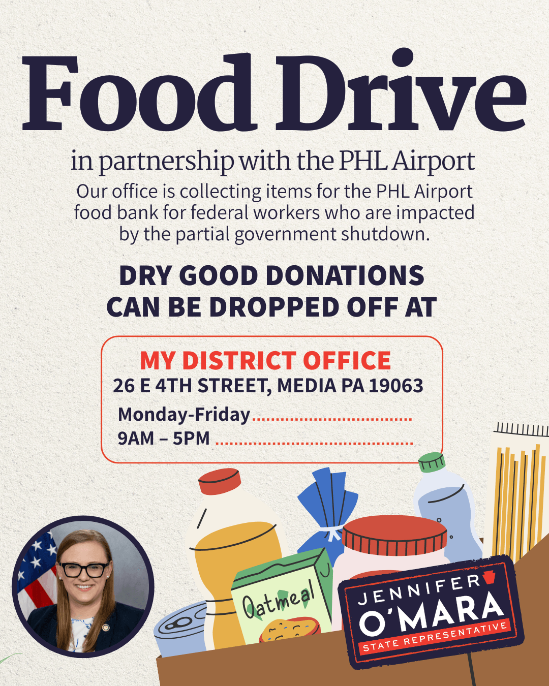 Due to the ongoing partial government shutdown, my office is once again teaming up with PHL Airport to collect food for their food bank. Between Monday and Friday, 9 am to 5 pm, you can drop off dry goods at my office to benefit federal workers who are currently going without pay. The most needed items include: nuts/seeds, spices, syrup, coffee/tea bags, rice, pasta, pasta sauce, condiments, canned goods (vegetables, beans, soup, fruit, stock) cereal, oatmeal, pancake and muffin mix, peanut butter, nut butters, cooking oils, granola bars, meal kits (Hamburger Helper, etc.), canned meats, bread, crackers, tortillas, baby food, baby formula, and juice boxes.