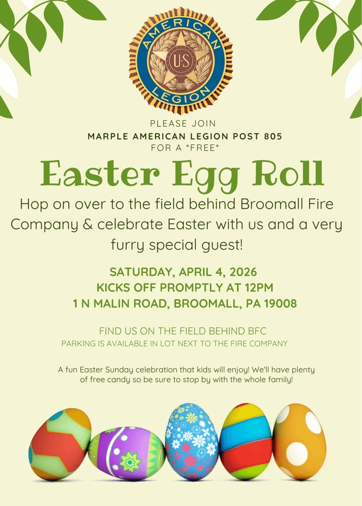 The Marple American Legion is having an Easter Egg Roll on Saturday, April 4, at 12 p.m. at 1 N. Malin Road.