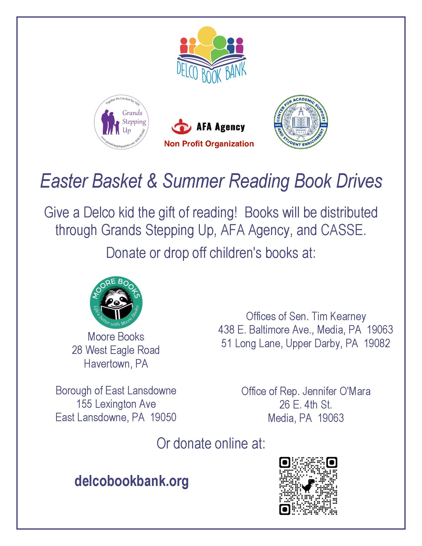 My office is participating in a local children’s book drive to help put books in the hands of Delco children. We are a drop-off site for the Delco Book Bank’s Easter Basket and Summer Reading Book Drives. Feel welcome to drop off new or gently used children’s books at my office!