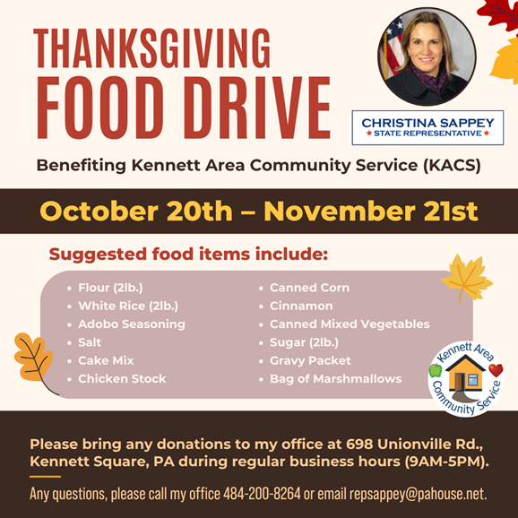 Thank you for subscribing to my E-newsletter. If you need assistance with any state-related issue, please reach out to my office at 484-200-8264, or visit us at 698 Unionville Road, at the intersection of routes 82 and 926. Follow me on Facebook and Instagram.