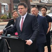 Rep. Jared Solomon announced a grant for the Wissinoming Civic Association to fund several solar trash compactors on Torresdale Avenue during a news conference Feb. 26.