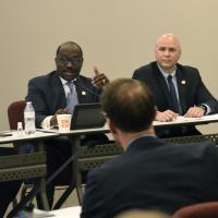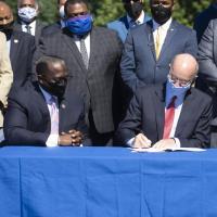 Rep. Dan Williams watches as Gov. Tom Wolf signs two Law Enforcement Reform Bills after both passed unanimously in the House and Senate.