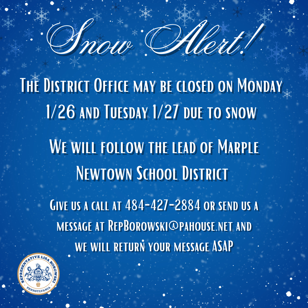Those who read my newsletter with any regularity know I am no fan of winter and even less so of snow. It is the cancellations which are tremendously frustrating. I was looking forward to heading back to Harrisburg for session next week and already our Monday and Tuesday sessions have been cancelled. Ugh. We are also anticipating a closure of the district office. Best to keep everyone off the roads and parking lots so the clean-up can proceed.