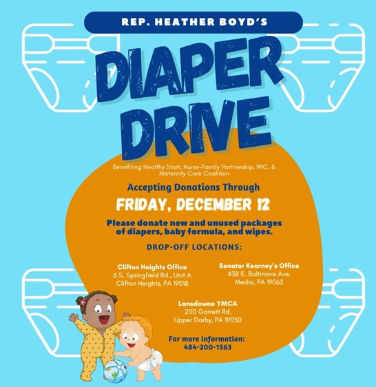 My office is collecting donations of diapers, wipes, and formula for local WIC, Nurse-Family Partnership, and Maternity Care Coalition programs. All donated items must be in new, unopened packages.