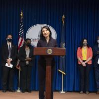 In her ongoing effort to protect children from COVID-19, Pa. House Democratic Leader Joanna McClinton and her colleagues speak at a press conference to defend having young people wear masks in schools.