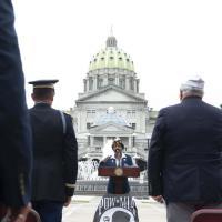 Veterans and members of the Armed Forces gather at Soldier's Grove at the State Capitol in Harrisburg to recognize the 50th Anniversary of the Prisoners of War and Missing in Action Remembering.