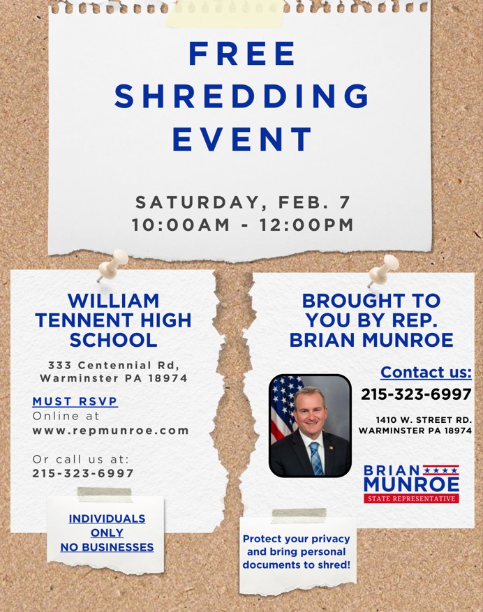 Tomorrow is our winter Shred Event! Come out to William Tennent High School between 10 a.m. and noon to have unneeded personal documents shredded for free.