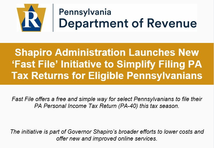 The PA Department of Revenue launched a free pilot program offering certain Pennsylvanians a simplified way to file their PA Personal Income Tax return. If you’re eligible, you’ll receive a letter in the mail encouraging you to use Fast File through myPATH, the online tax-filing system. The department identified nearly 100,000 residents eligible for Fast File, so keep your eye on your mail!