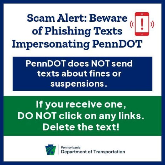 The Pennsylvania Department of Transportation (PennDOT), Pennsylvania State Police (PSP), and the Pennsylvania Turnpike Commission (PA Turnpike) are warning about text phishing scams currently targeting Pennsylvanians that threaten the suspension of driving and vehicle registration privileges for not paying a fine or toll violation. PennDOT does not send text messages to customers for any reason, and uses traditional mail sent via the U.S. Postal Service to communicate with Pennsylvanians.