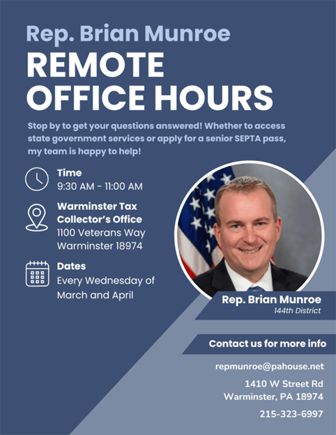 The much-dreaded tax season has a few weeks left! Though our office cannot help with preparing income taxes, we will be at the Warminster Tax Collector's Office every Wednesday in March and April from 9:30AM - 11:00AM to answer questions about state-related services and issues.
