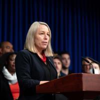 Rep. Mandy Steele, D-Allegheny, helps constituents replace illegible license plates with the Allegheny Valley Regional Police Department.