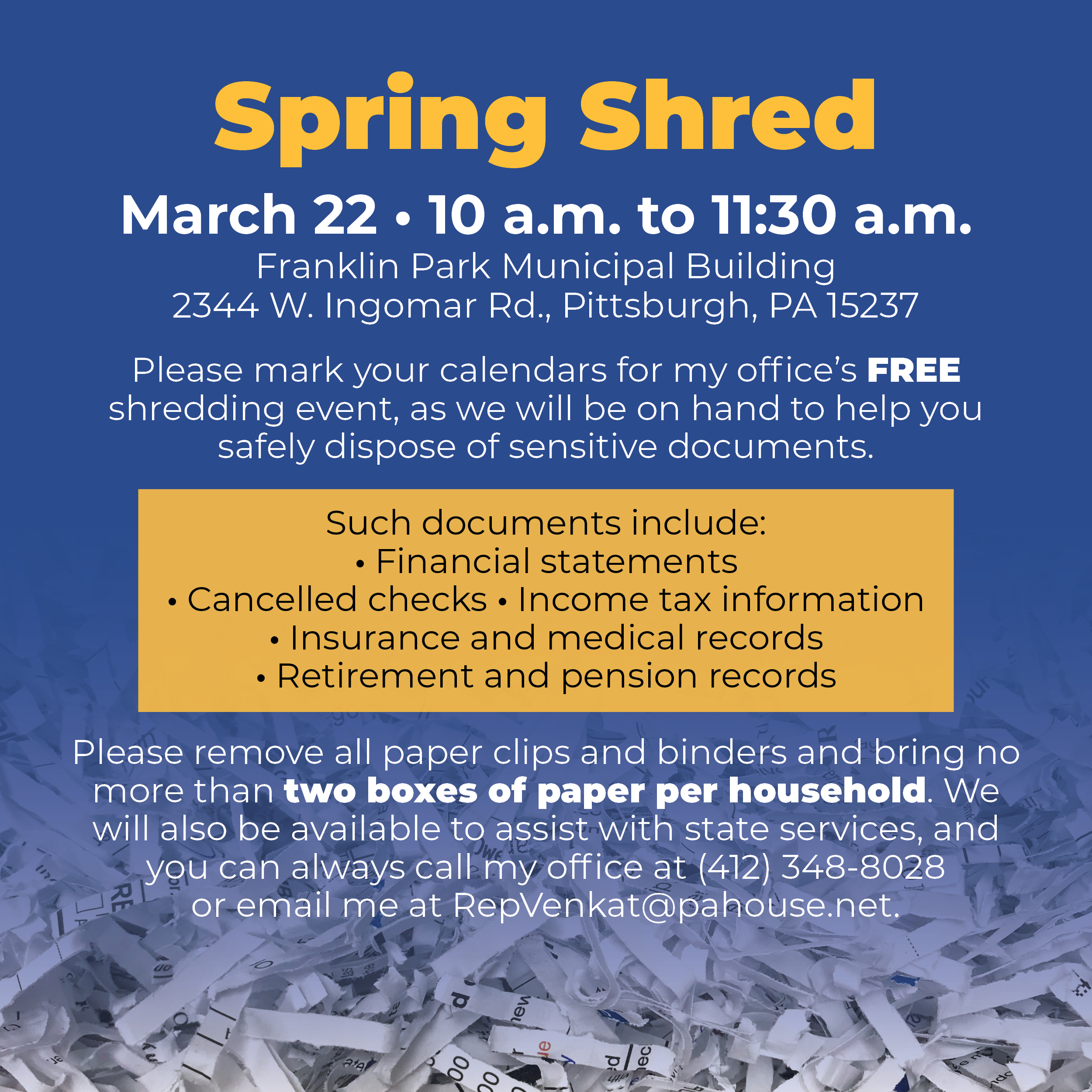 Our Spring Shred event will be held from 10 a.m. to 11:30 a.m. on March 22 at the Franklin Park Municipal Building, located at 2344 W. Ingomar Rd. We will help you safely dispose of sensitive documents (a limit of two boxes of paper per household, please) and will also be available to assist with state services. Questions? Call my office at (412) 348-8028.