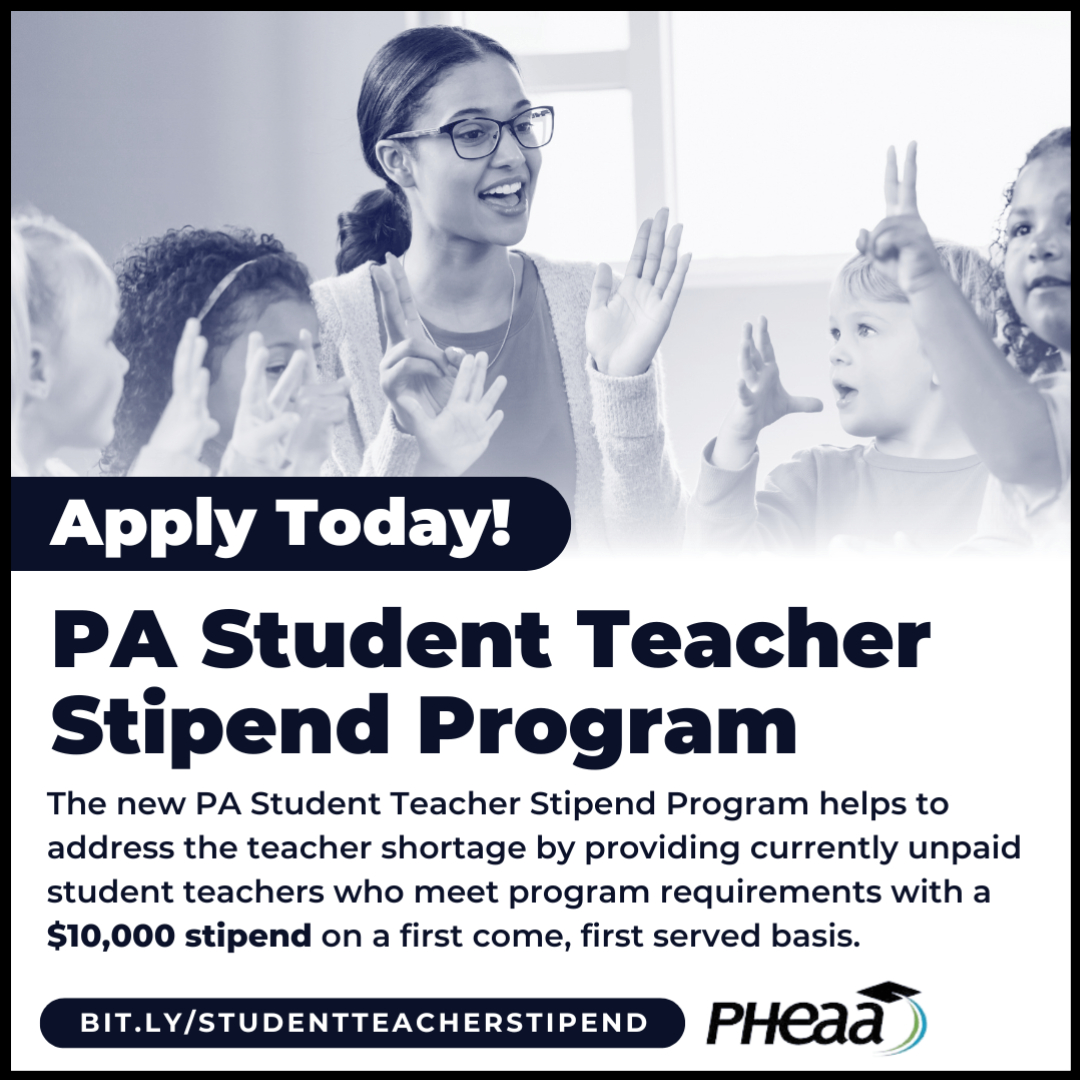 The 2025-26 Student Teacher Application for PA is now open and provides $10,000 to eligible student teachers who are currently unpaid. Visit this page to read more about the program and apply.