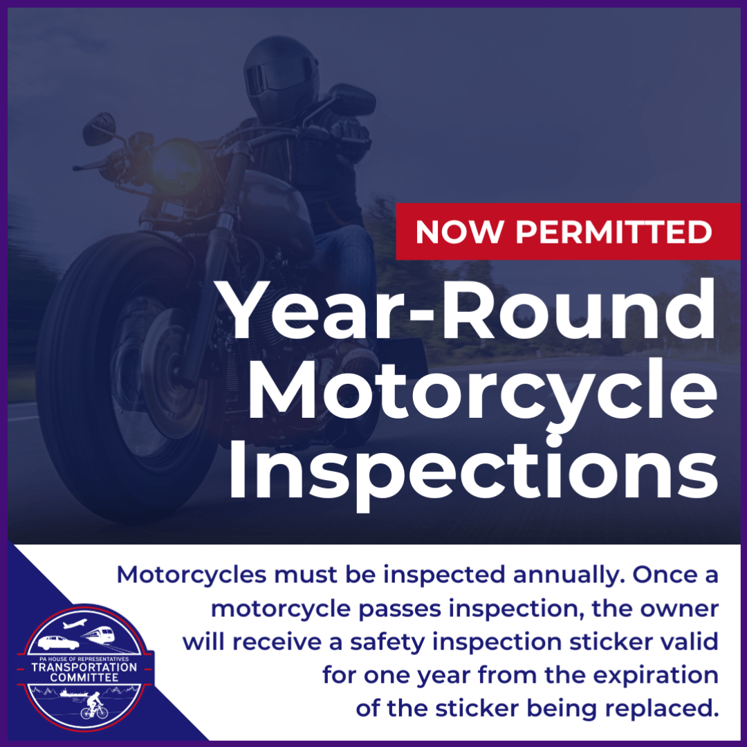 Motorcycles can now be inspected year-round, just like passenger vehicles, and are not limited to March through October inspections. Annual motorcycle inspections are still required, and once a motorcycle passes, the new safety inspection sticker will be valid for one year from the expiration of the previous sticker. Visit this page to learn more, and this page for state information on motorcycle safety.