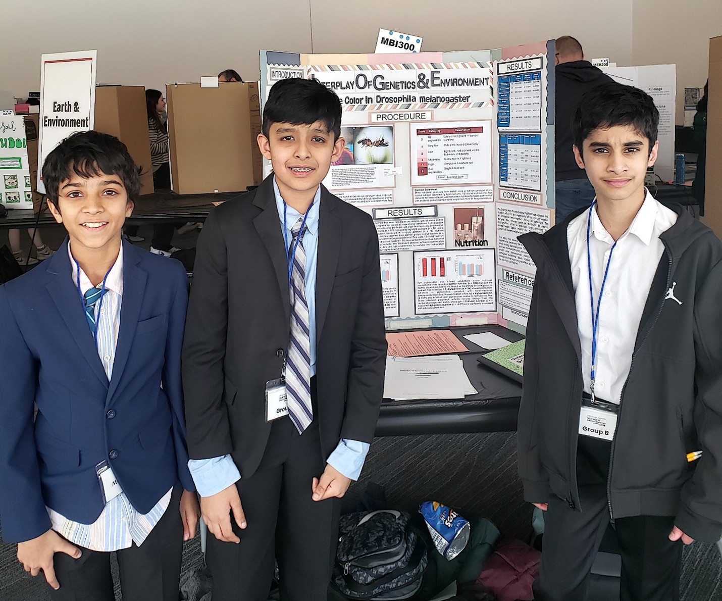 Seventh graders Dhruv Chethan, Shreyan Kapoor, and Aarav Singhal from Ingomar Middle School took first place in Intermediate Biology at the PRSEF Science Fair. Their project explored the genetics and environment of fruit flies.
