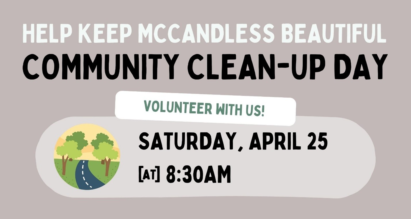 McCandless will be holding a Community Clean-Up Day on April 25 at 8:30 a.m. at the McCandless Department of Public Works Garage. Supplies, including gloves, bags, safety vests, and snacks, will be provided.