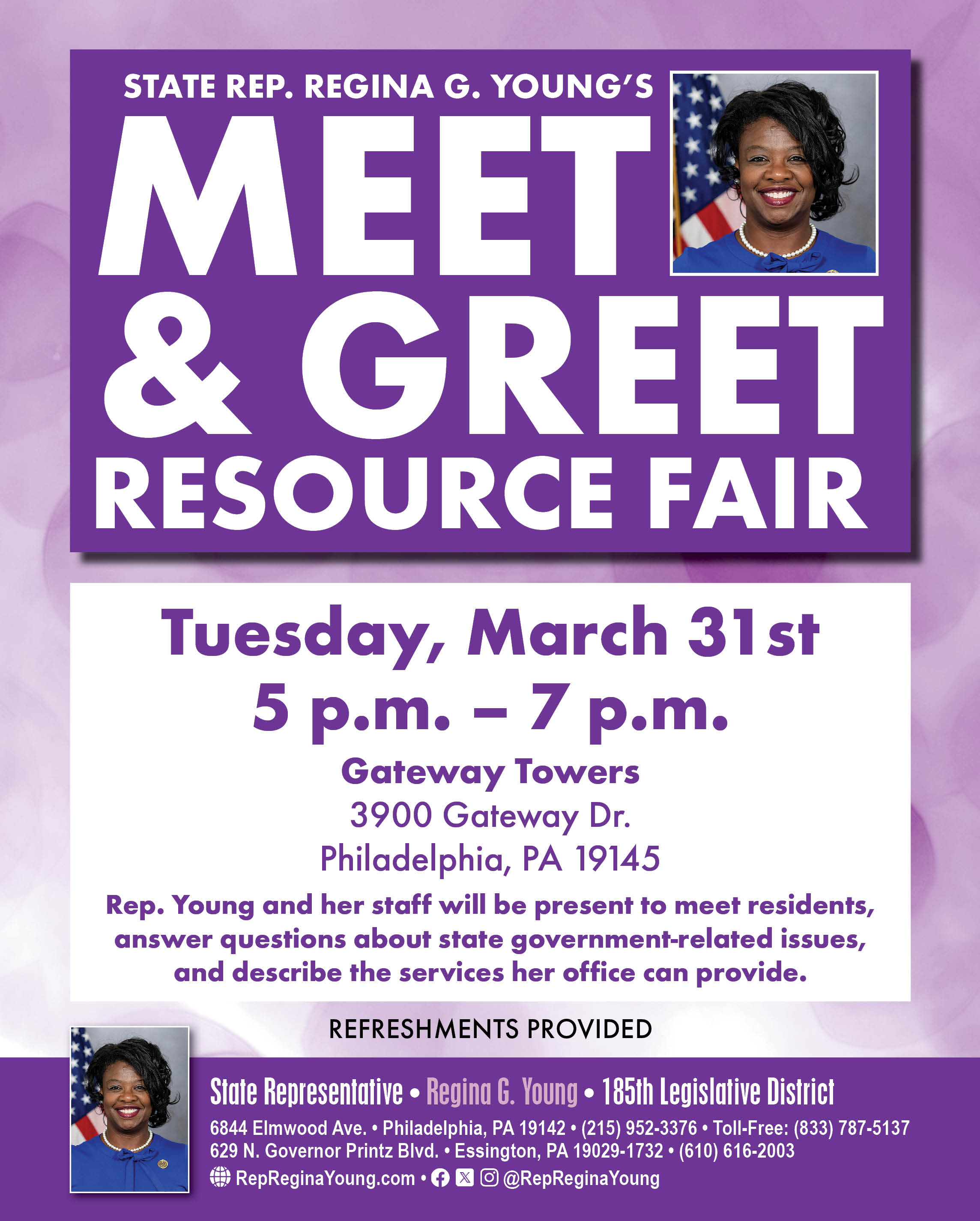 If you’re a resident of Gateway Towers, I hope you can join me at my Meet & Greet Resource Fair on Tuesday, March 31, from 5 p.m. to 7 p.m. We’ll have light refreshments and connect you with state and local services and resources for which you may qualify. Come say hi and get connected!