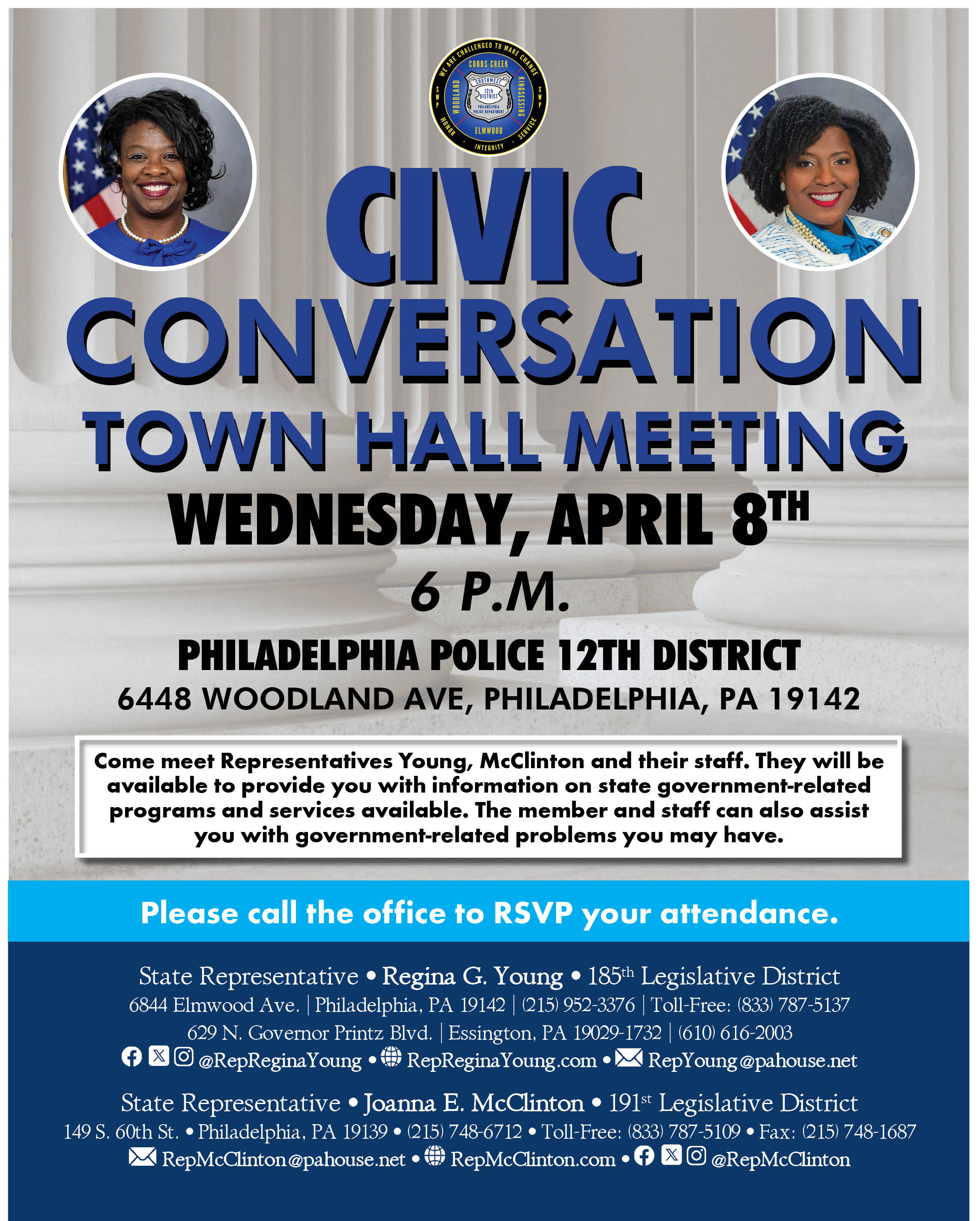 My next Civic Conversation is happening on Wednesday, April 8, at 6 p.m. at the PPD 12th District Headquarters, 6448 Woodland Ave., Southwest Philadelphia. I’ll be joined by our neighbor and history-making Speaker of the House, Joanna McClinton! Come learn how government works for YOU and how you can join the conversation. Call my office to let us know you’ll be attending!